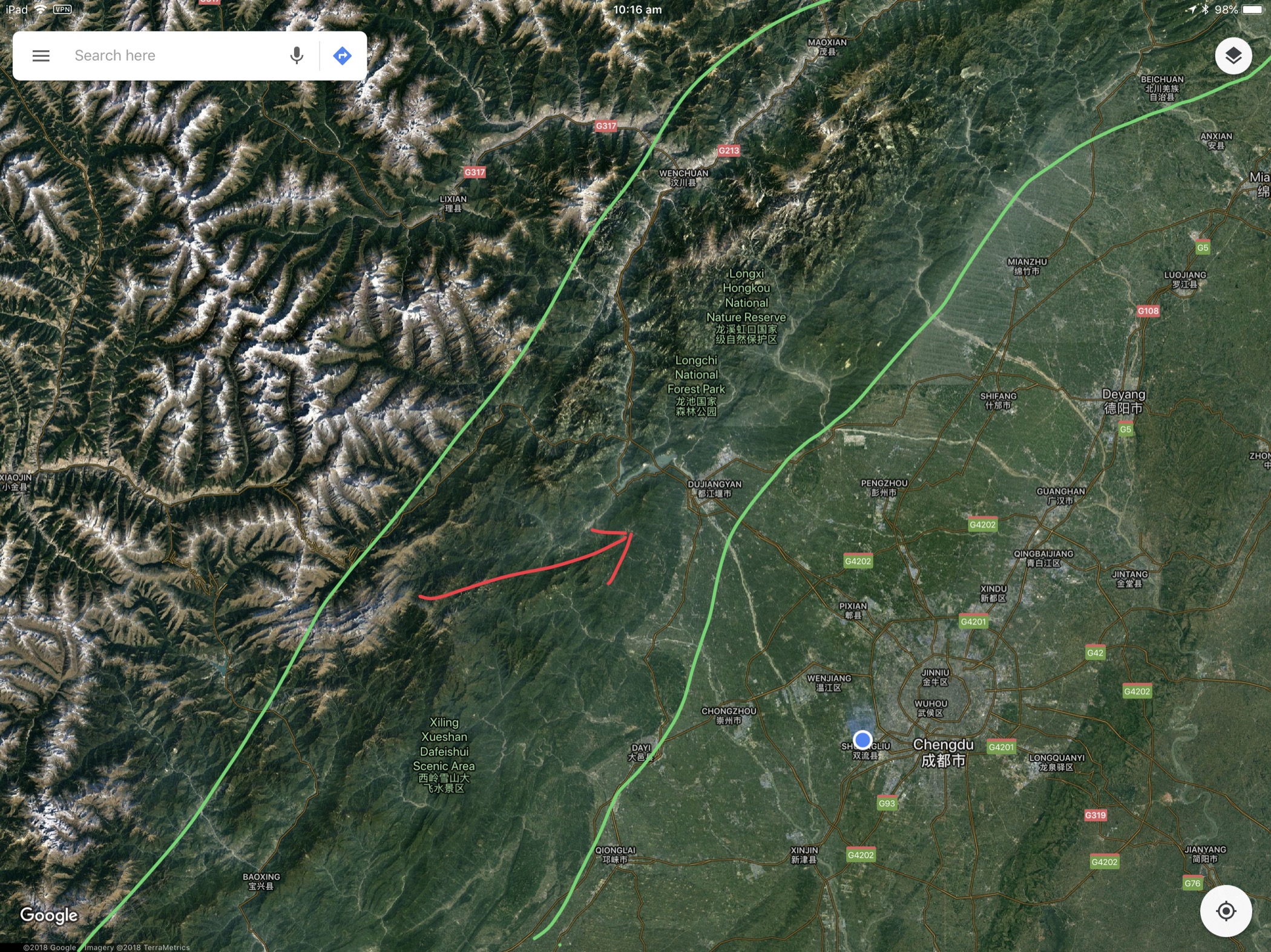Red arrow points to Qingcheng Houshan. The band between the green lines is peppered with places to visit for a day trip from Chengdu. The the west, as the snow on the peaks suggests in this Google Map, the mountains become higher and more rugged. The stream in the pictures below flows southwest onto the plain and then south to join another and another before passing through Chongzhou. Just to the north is the much larger river which flows through DujiangYan. More on that in my next post.