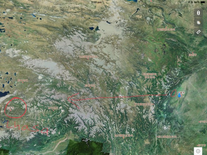 Chengdu is actually in the centre of Sichuan Province. The plain on which it sits, in the Sichuan Basin comes to an end to the west closeby. The Basin is fringed by small mountains like Qingcheng Shan which rise steadily up to the Tibetan Plateau. The red arrow approximately shows the end of Sichuan and the beginning of Tibet.
